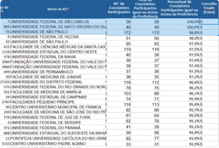 Já o curso de Medicina da UFMS em Campo Grande aparece na 29ª posição do ranking, com 92,7% de proficiência, também com conceito 5.
